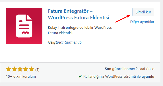 Eklentiler kısmından arama kısmına “Fatura Entegratör” diye aratıyoruz, daha sonra “Şimdi Kur” butonuna basarak kuruyoruz.