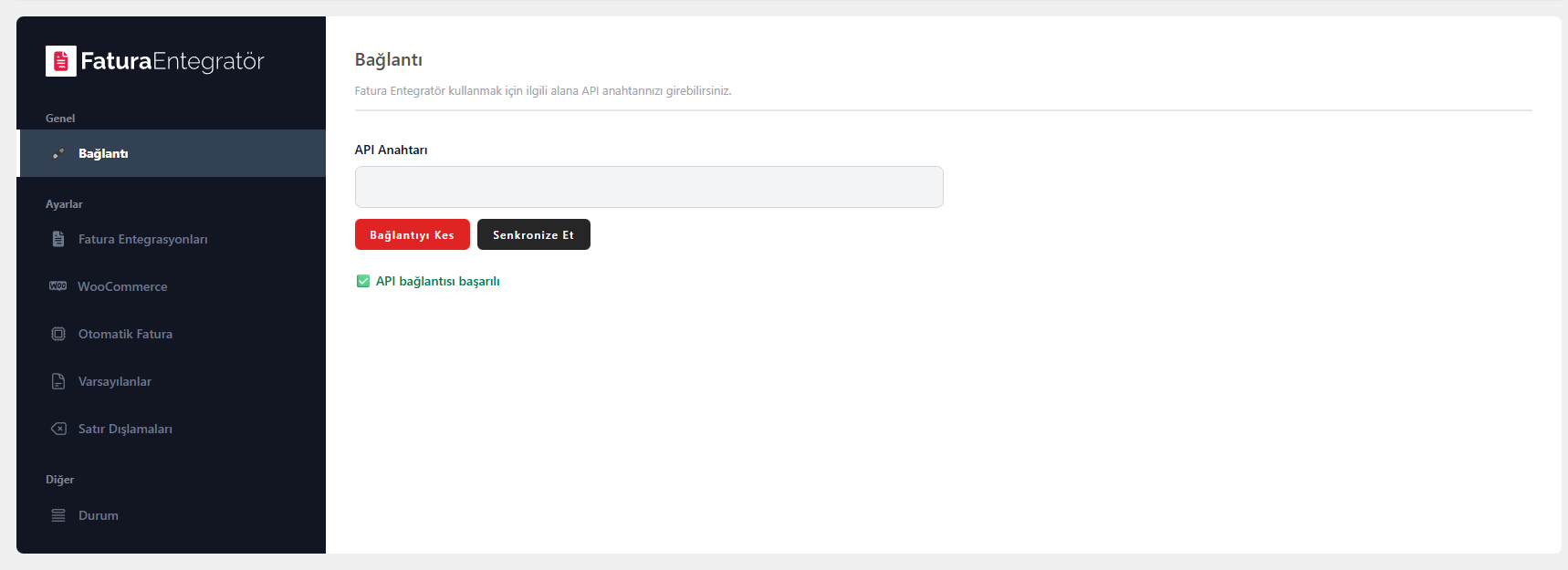 Kurulum sonrasında app.faturaentegrator.com panelinize giriş yapınız Ayarlar > API ve Platform Uygulamaları sayfasına takip ederek size ait olan API anahtarını kopyalayın ardından tekradan WordPress yönetim panelinize dönün ve kopyaladığınız KEY'i Fatura Entegratör > Ayarlar sayfasına yapıştırın. Kayıt sonrasında yaptığınız tüm entegrasyonlar ve ayarlar WordPress siteniz ile eşleşecektir.