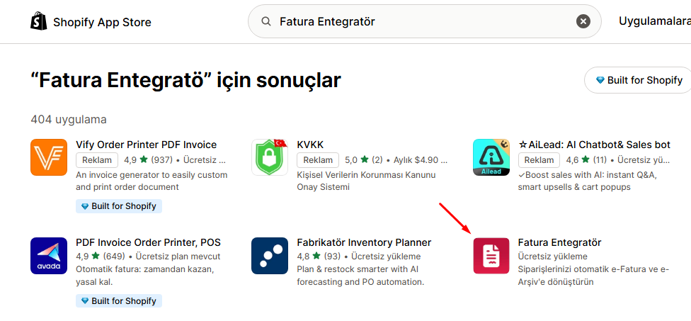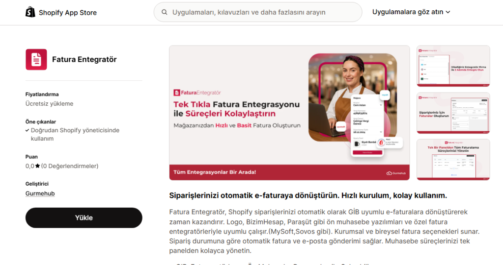 Shopify Apps kısmından arama kısmına “Fatura Entegratör” diye aratıyoruz, Fatura Entegratör eklentisine tıklıyoruz. Ardından “Yükle” butonuna tıklıyoruz ve yüklüyoruz.