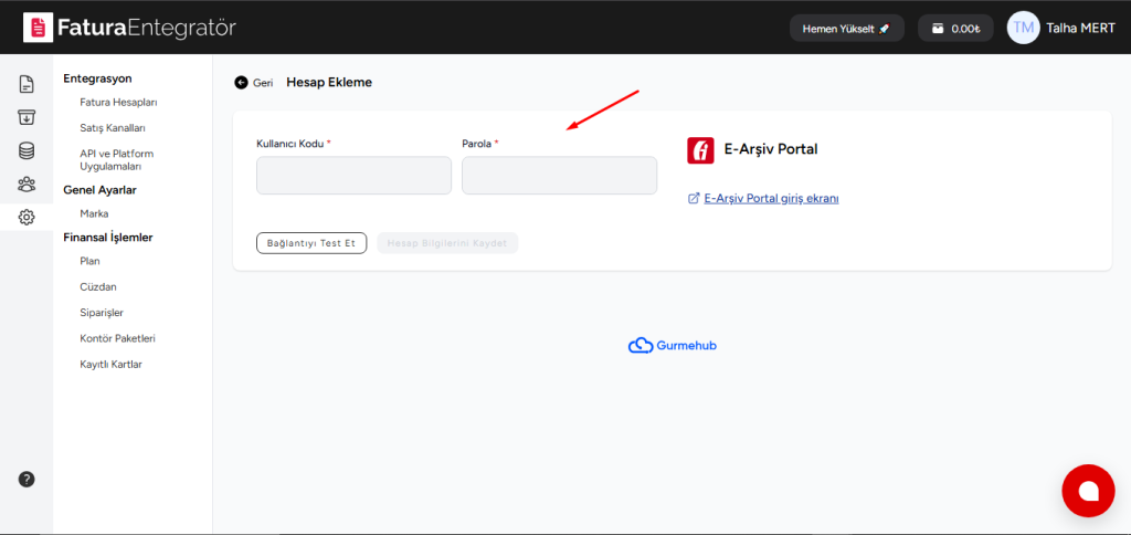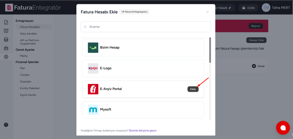 Fatura Entegratör > Ayarlar > Fatura Hesapları kısmından “Hesap Ekle” diyoruz