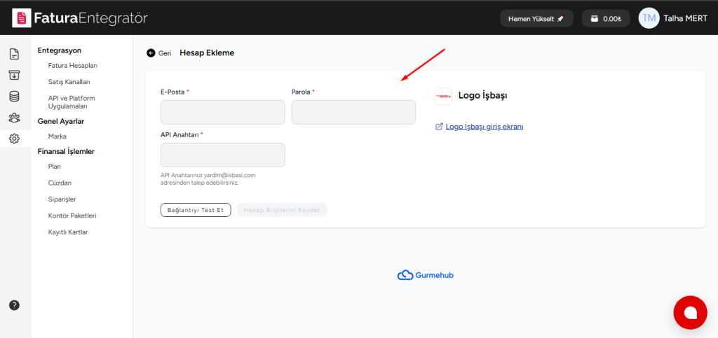 Logo İşbaşı tarafından gelen API bilgilerini bu kısma yazıyoruz, daha sonrasında “Bağlantıyı Test Et” diyerek API bilgilerini test ediyoruz ve entegrasyonu sağlıyoruz.