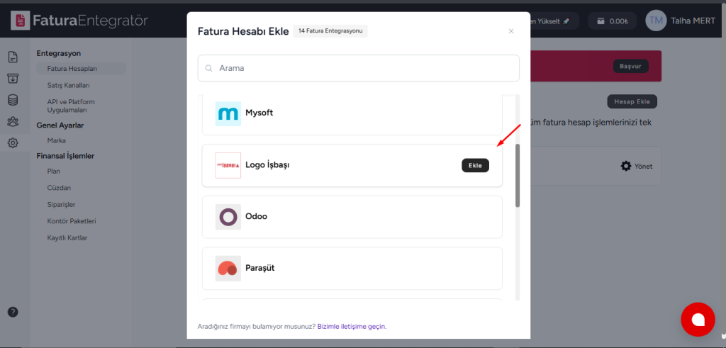 Fatura Entegratör > Ayarlar > Fatura Hesapları kısmından “Hesap Ekle” diyoruz