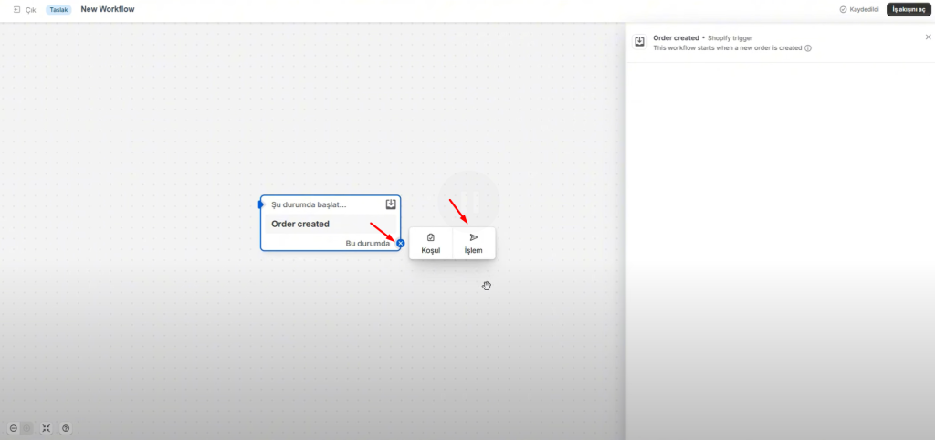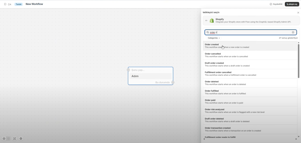 Arama alanına “Order created” yazıyoruz ve çıkan sonuçlardan seçiyoruz.